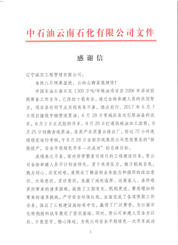 我公司于今日收到由中國石油云南石化有限公司發(fā)給我方的《感謝信》一封,信中提到:對于我方所監(jiān)理服務的煉油項目自2006年啟動籌備工作至今,我方監(jiān)理人員不計利益得失,勇于承受壓力,使得該項目近日順利投產試車成功。對于我單位的工作給予極大的肯定以及衷心的感謝。對方還提到:希望雙方在日后的共同發(fā)展中,互惠互利,共贏發(fā)展。