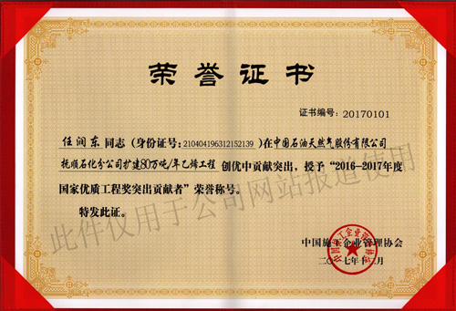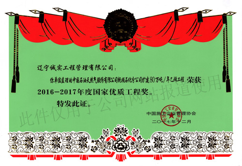 2017年11月10日,根據(jù)中施企協(xié)字【2017】66號(hào)文件——《關(guān)于表彰2016-2017年度國(guó)家優(yōu)質(zhì)工程獎(jiǎng)的決定》公告,我單位所監(jiān)理的“中國(guó)石油天然氣股份有限公司撫順石化分公司擴(kuò)建80萬噸/年乙烯工程”榮獲2016-2017年度國(guó)家優(yōu)質(zhì)工程獎(jiǎng),該項(xiàng)目總監(jiān)“任潤(rùn)東”還獲得了“2016-2017年度第二批國(guó)家優(yōu)質(zhì)工程獎(jiǎng)突出貢獻(xiàn)者”的榮譽(yù)稱號(hào)。