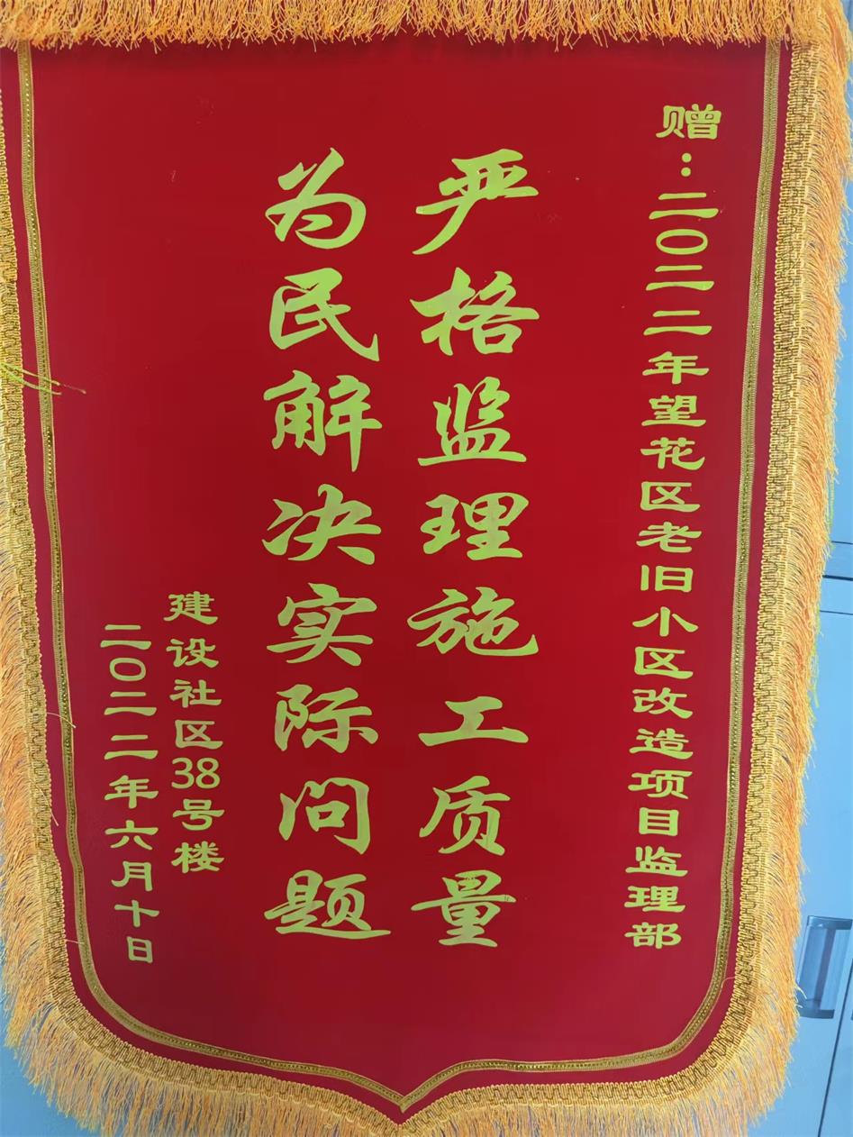 千濤萬漉雖辛苦,吹盡狂沙始到金。一面錦旗既是一份肯定。我們將秉承“誠實(shí)、責(zé)任、專業(yè)、超越”的監(jiān)理精神,接受政府和市民的共同監(jiān)督,一如既往、不忘初心、盡職盡責(zé),為推動老舊小區(qū)改造,優(yōu)化小區(qū)環(huán)境治理,建設(shè)文明城市做出應(yīng)有的貢獻(xiàn)!