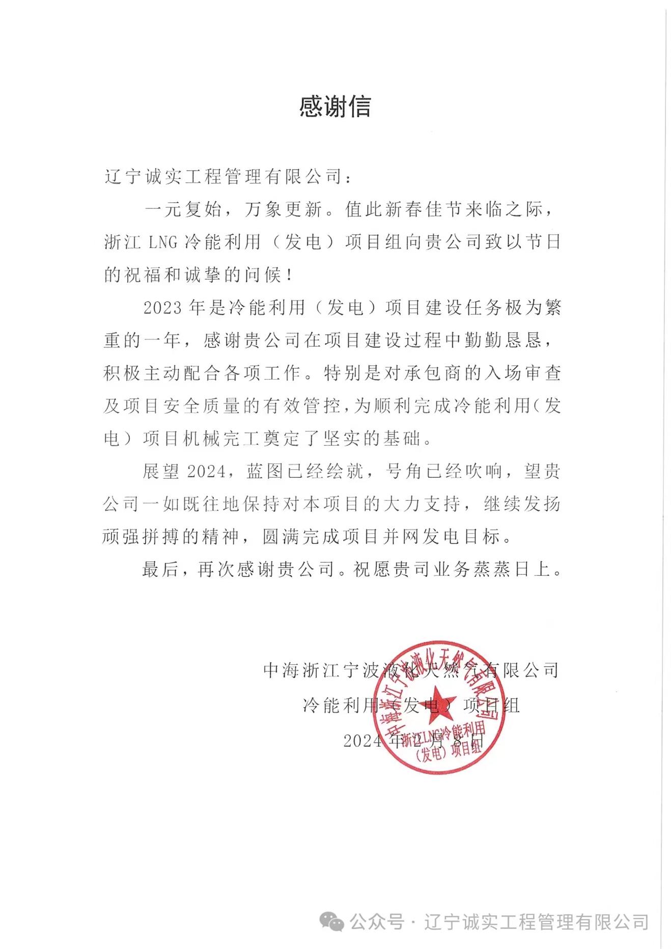 浙江LNG冷能利用(發(fā)電)項目組向公司發(fā)來了感謝信,信中肯定了公司項目部人員在2023年的努力,特別是對于承包商入場審查及項目安全質量的有效管控,為項目機械完工奠定了堅實的基礎。該項目是積極響應國家及浙江省“十四五”規(guī)劃的節(jié)能減排政策,落實“綠色低碳”發(fā)展戰(zhàn)略的示范項目,項目投產(chǎn)后,預計年凈發(fā)電量約為2408萬度,節(jié)省標準煤超3000tce,年減少CO₂排放可達18000多噸。展望2024年,項目部在黃思敏總監(jiān)的帶領下,將認真執(zhí)行監(jiān)理職責,積極推進項目建設,爭取項目早日建成投產(chǎn)。