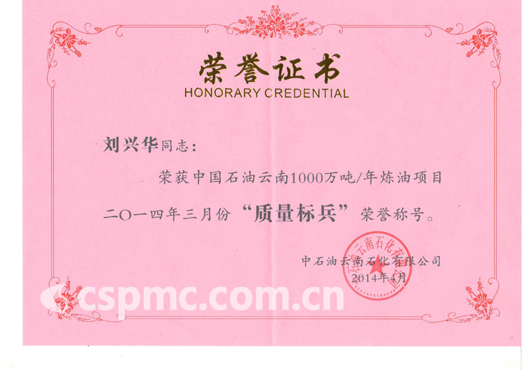 熱烈祝賀劉興華同志榮獲中國(guó)石油云南1000萬(wàn)噸/年煉油項(xiàng)目2014年3月份“質(zhì)量標(biāo)兵”榮譽(yù)稱號(hào)!